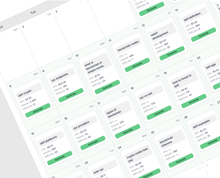 See which keywords are mapped to which days. Spot volume, CPC, and decide what’s worth publishing. Strategy without the sticky notes.